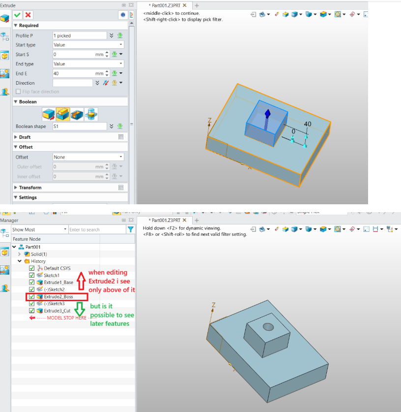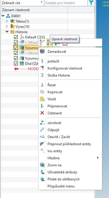 ad. 2: when choose “Edit feature” (under RMB) then you can edit feature dimension (hole size, extusion value) with visibility all next shapes CZ: Když se vybere “Uprav vlastnost” jsou vidět i všechny později vytvořené prvky. Lze takto ale editovat jen vlastnost prvku (velikost díry, výška extuze atd) ale ne třeba výchozí skicu.