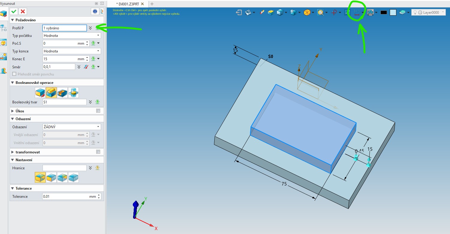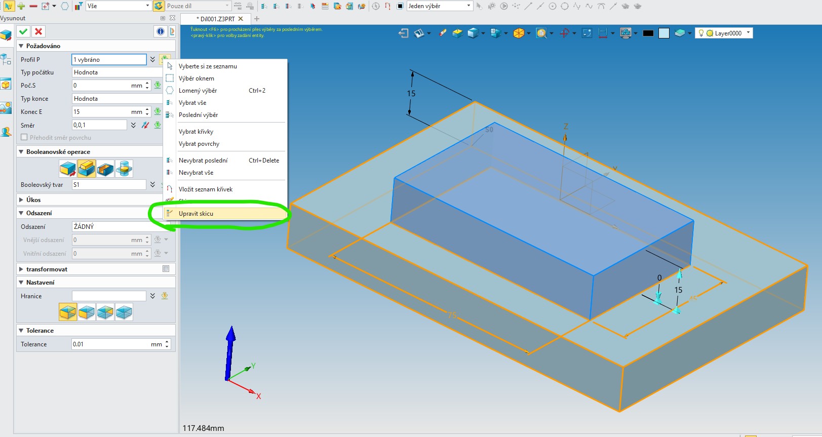 ad .1: Clic to icon “Show dimension” for switch on visibility of all dimensions (inc. values of extusion etc.). Unfortunatelly is not posible to edit it by double click. Only by “Edit sketch” in RMB or by open menu under green arrow. CZ: Klikněte na ikonu “Kóty Zap/Vyp” a budou vidět všechny kóty, vč, hodnot skici či extruze a pod. Bohužel nelze tyto kóty editovat poklikáním, pouze editací pod pravým tlačítkem (“Uprav skicu”) či tím stejným přístupným pod zelenou šipkou.