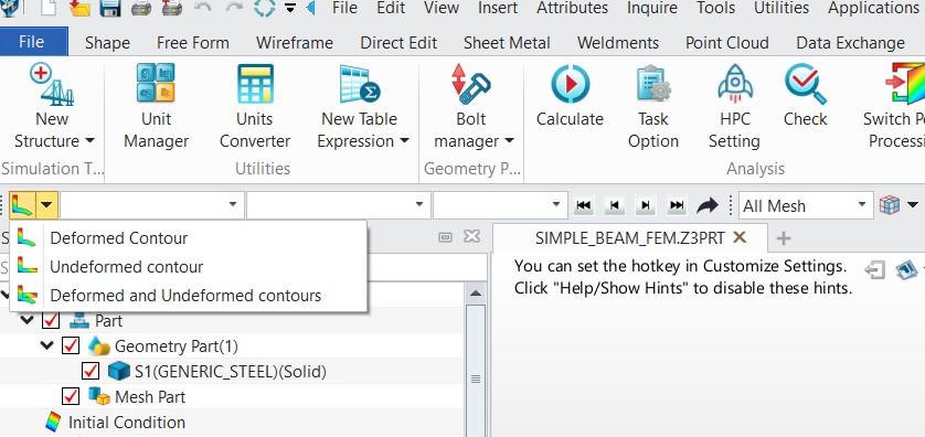 I have another question regarding static analysis using the finite element method (FEM). After calculating my task, the graphical result is displayed. And then two shapes - 1. deformed with color graphical analysis, 2. original part (undeformed).